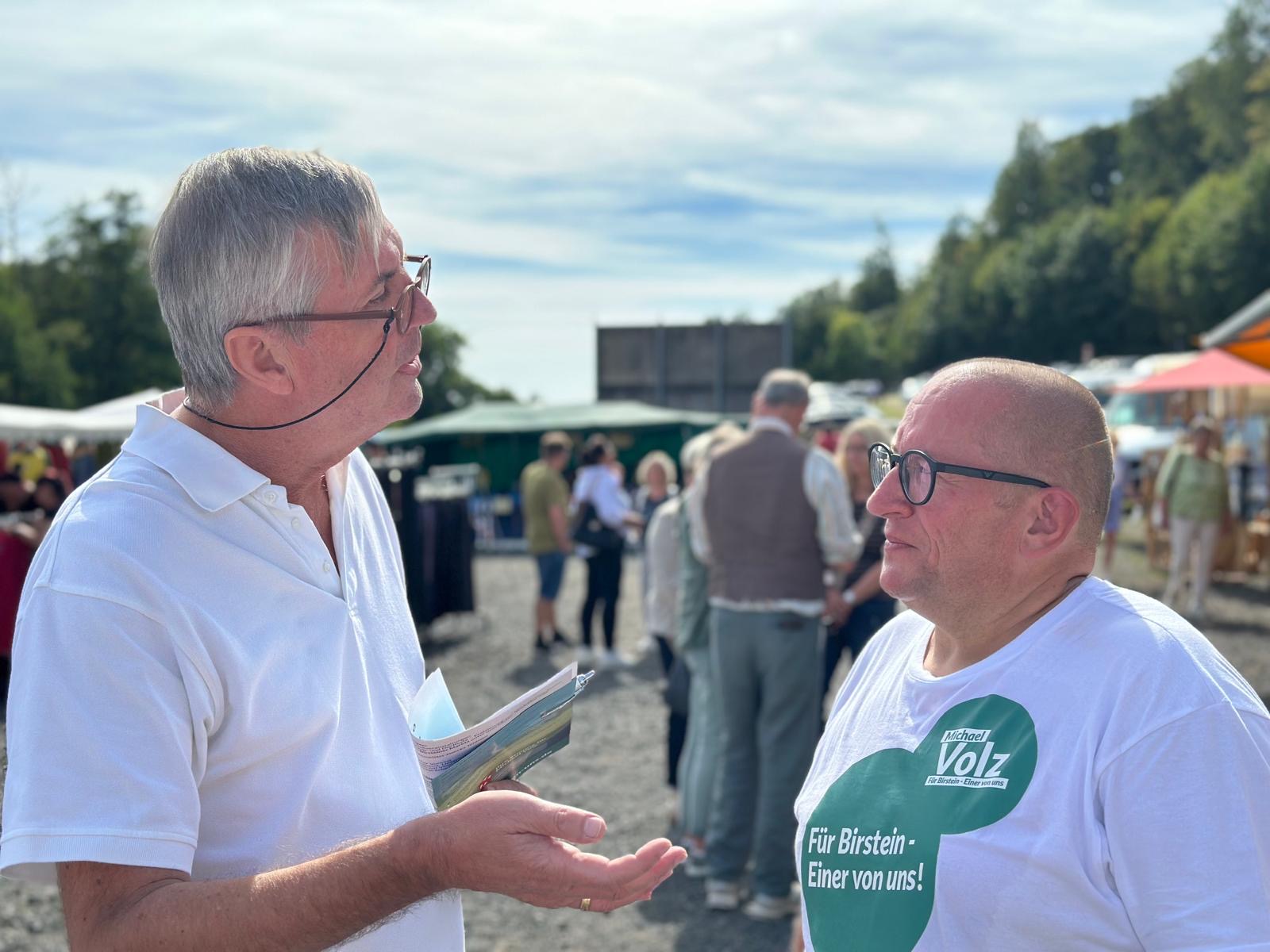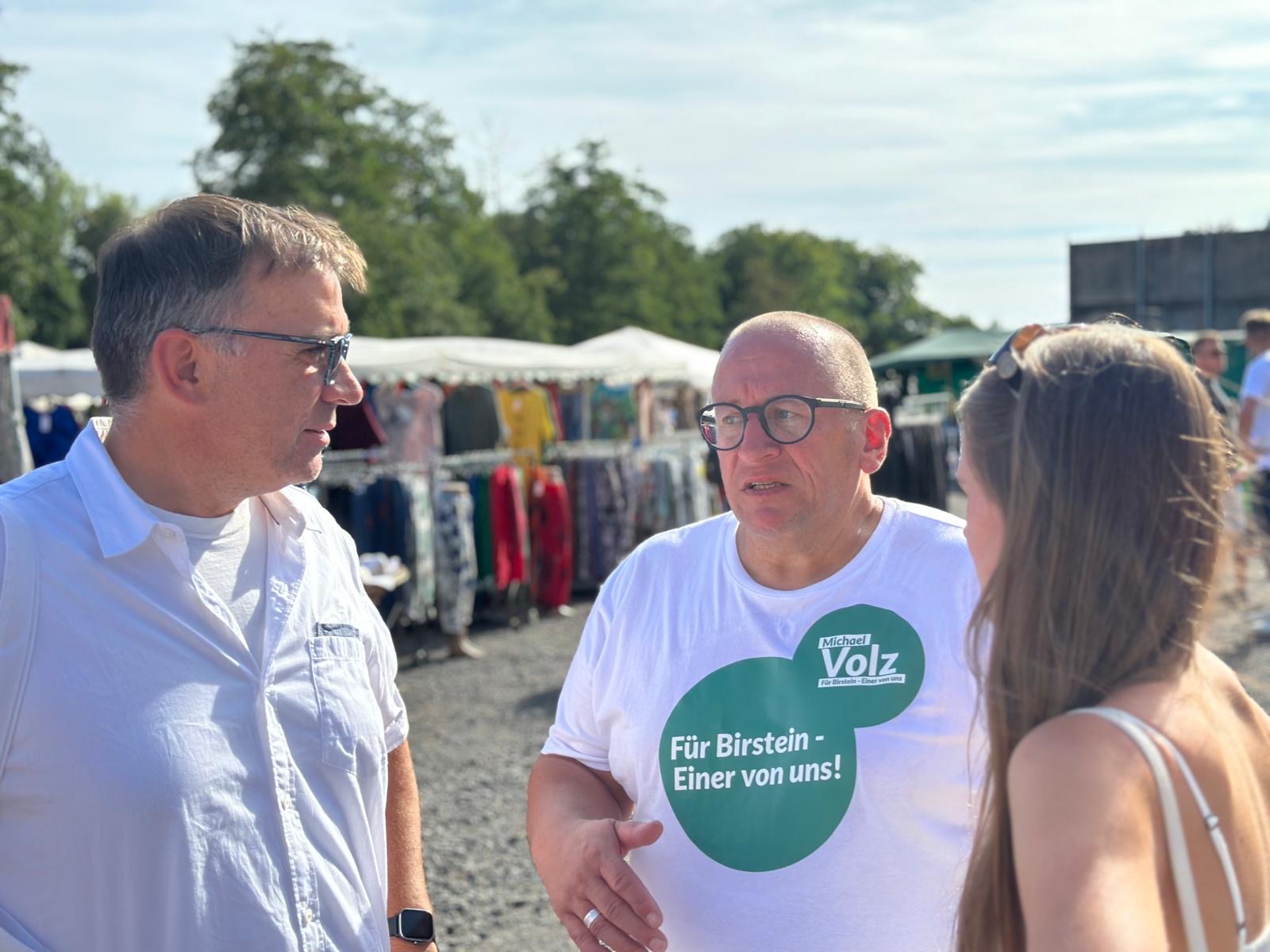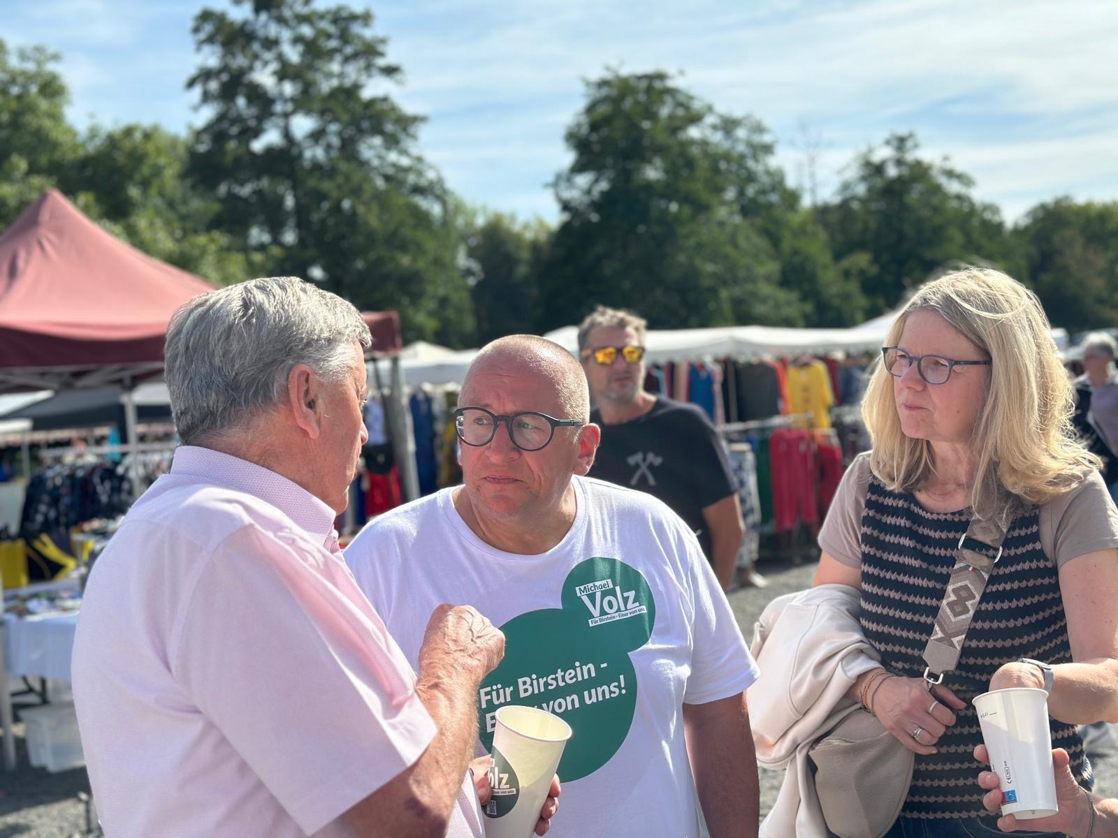– Strah­len­der Son­nen­schein, gute Lau­ne und vie­le inter­es­sier­te Bür­ge­rin­nen und Bür­ger: Die Bir­stei­ner-Markt-Gesprä­che am Info-Stand von Bür­ger­meis­ter­kan­di­dat Micha­el Volz waren für den unab­hän­gi­gen Bewer­ber ein vol­ler Erfolg. „Es war ein rund­um gelun­ge­ner Sonn­tag. Mei­ne 24 Unter­stüt­ze­rin­nen und Unter­stüt­zer an die­sem Tag sowie ich selbst kamen mit sehr vie­len Men­schen ins Gespräch – mit Jung und Alt, mit Markt­be­su­chern, mit Inter­es­sier­ten nach dem Kirch­gang, mit Bür­ge­rin­nen und Bür­gern sowie mit den Kerb­bu­schen, dem wil­den Weib, die den Markt auch zur Bir­stei­ner Kerb machen.